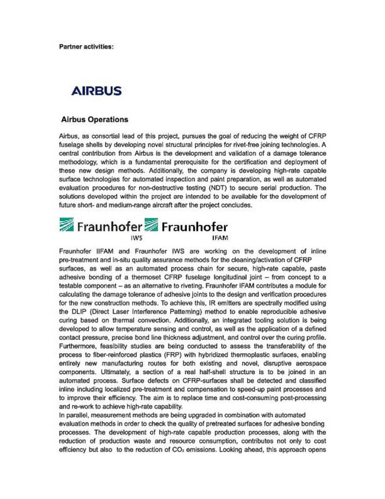 HELIOS is developing new approaches for lightweight, high-rate capable CFRP fuselage shells with a strong focus on rivet-free structural joining. The project brings together industrial and research partners to investigate novel design principles, manufacturing technologies, and validation methods for future aircraft structures.